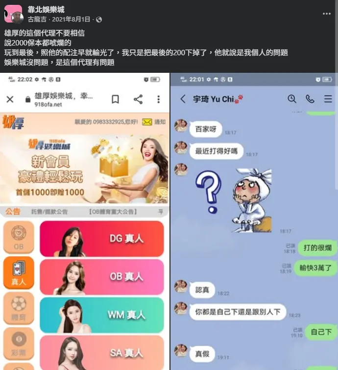 我們來看一個真實發生的慘痛教訓。在臉書博弈社團中,有玩家憤怒爆料了自己的經歷;這名玩家並不是因為平台系統故障領不到錢,而是誤信了雄厚娛樂城某位代理的「2000 元保本」話術,代理聲稱只要跟著他的配注策略走,輸了算他的,贏了算玩家的。(參考連結:Facebook 社團案例)